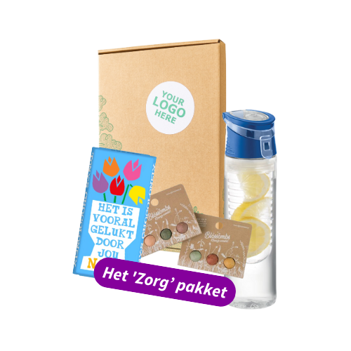 In dit pakket komen gebruik en beleving samen. Een drinkfles met infuser helpt om voldoende te drinken. De Tony’s Chocolonely reep met eigen wikkel zorgt voor een verwenmoment. De Blossombs zaadbommetjes voegen iets vrolijks toe. Alles verpakt in een geschenkdoos.
