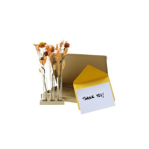 Niet iedereen werkt op dezelfde locatie. Met droogbloemen verras je medewerkers ook thuis. Ze blijven lang mooi, behouden hun kleur en zorgen voor een blijvende herinnering. Kies voor een houten houder met een gegraveerde boodschap voor extra persoonlijkheid.