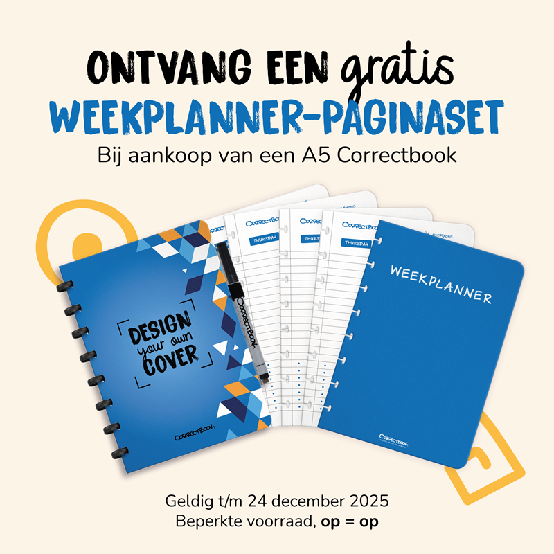 De komende weken hebben we waanzinnig leuke deals voor je in petto. Deals waarmee je 2025 goed afsluit en helemaal voorbereid 2026 ingaat. Zo ontvang je bij elke bestelde A5 Correctbook een gratis weekplannerset!
